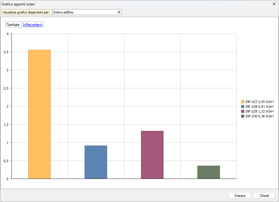 La funzione Stampe | Visualizza grafico apporti solari consente di ottenere una rappresentazione sintetica degli apporti solari presenti nella pratica, tramite un diagramma a barre verticali.
