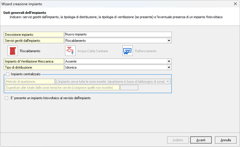 La funzione Wizard inserimento impianto termico è una procedura guidata che supporta la definizione dei dati relativi ai sottosistemi dell'impianto termico (generazione, distribuzione, regolazione, emissione) e consente di assegnare l'impianto alle zone termiche servite.