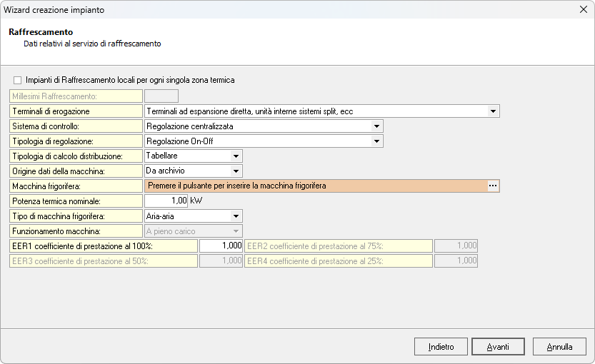 Nella pagina Raffrescamento è possibile indicare i dati della macchina frigorifera, i dati relativi ai sottosistemi di emissione e regolazione e l'eventuale produzione locale per zona termica.