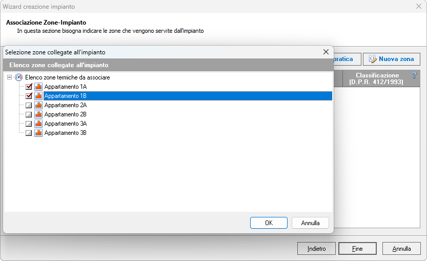 Nell'ultima pagina Associazione Zone-Impianto vanno indicate le zone servite dall'impianto. In questa fase è possibile creare nuove zone termiche non precedentemente inserite nella pratica.