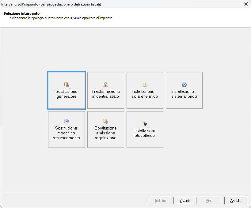 Nella prima pagina è possibile selezionare la tipologia di intervento da applicare all'impianto tra le seguenti opzioni: