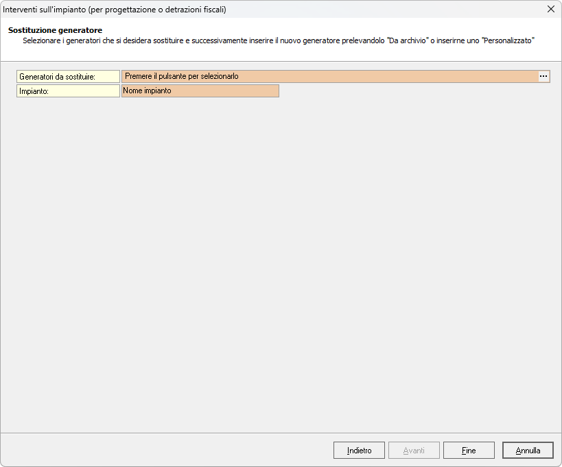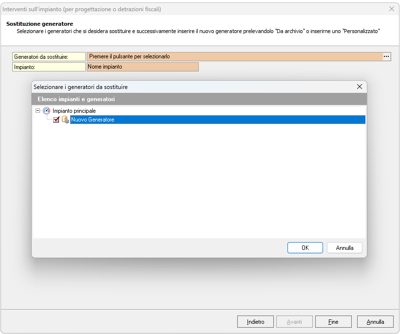 Ad esempio, in caso di Sostituzione generatore, occorre specificare i generatori da sostituire.