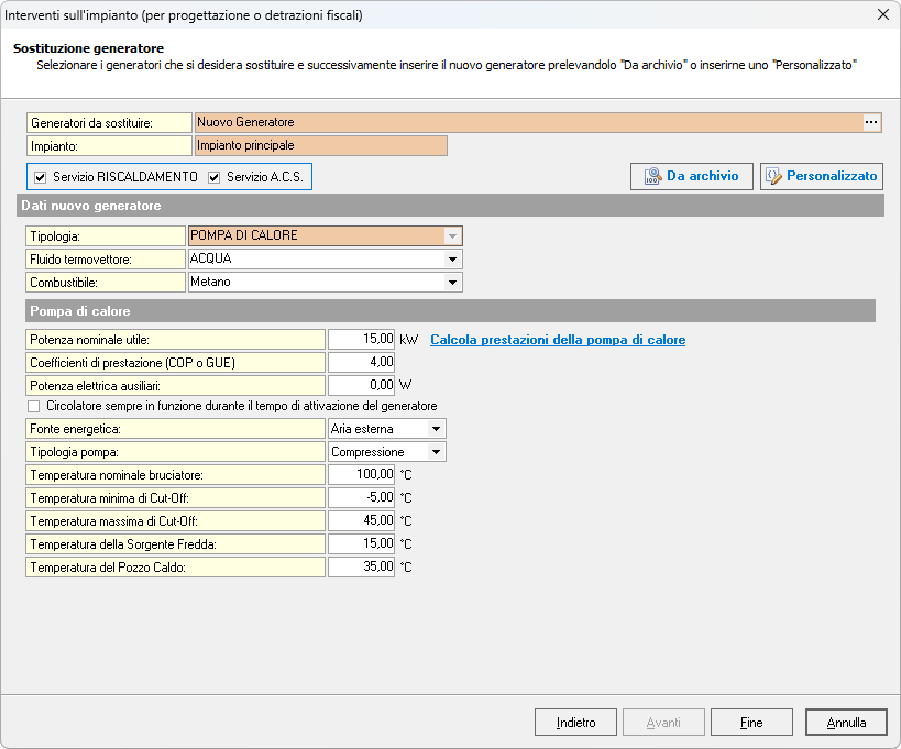 Successivamente, inserire i dati del nuovo generatore, prelevandolo da archivio oppure creandone uno personalizzato.