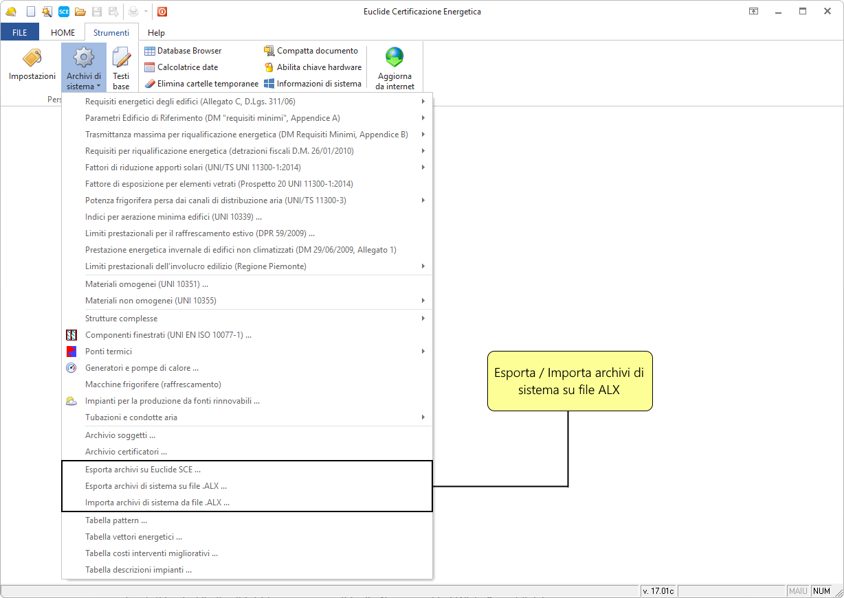 Strumenti | Archivi di sistema | Esporta archivi di sistema su file .ALX...Strumenti | Tabelle di sistema | Importa archivi di sistema su file .ALX...
