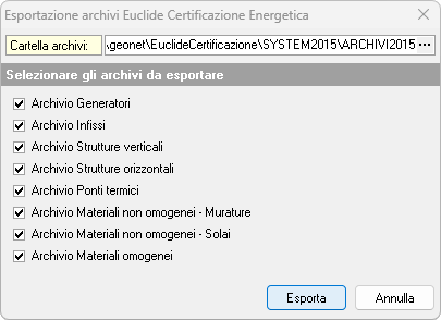 Cliccando sul comando di esportazione, viene aperta una finestra in cui è possibile scegliere il percorso da cui prelevare gli archivi e selezionare quelli da salvare.