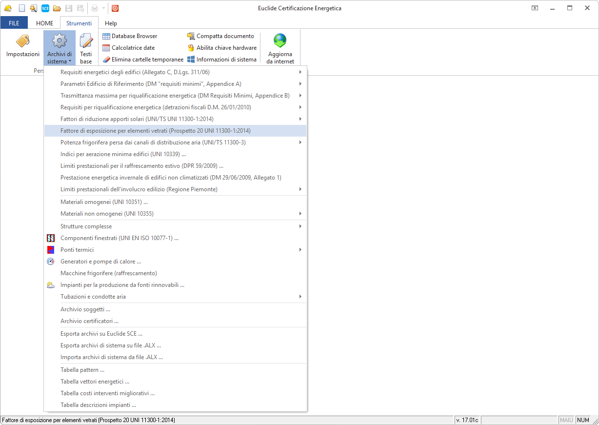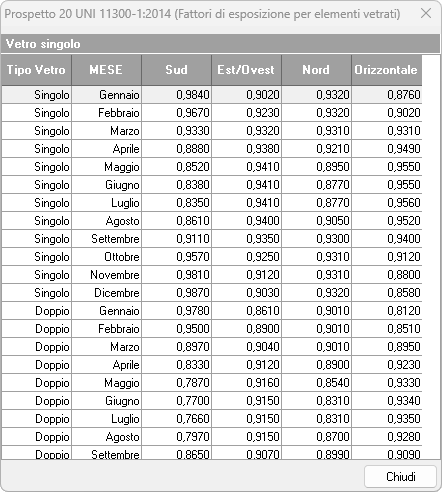 L'accesso all'archivio avviene tramite il comando Strumenti | Archivi di sistema | Fattore di esposizione per elementi vetrati (Prospetto 20 UNI 11300-1:2014).