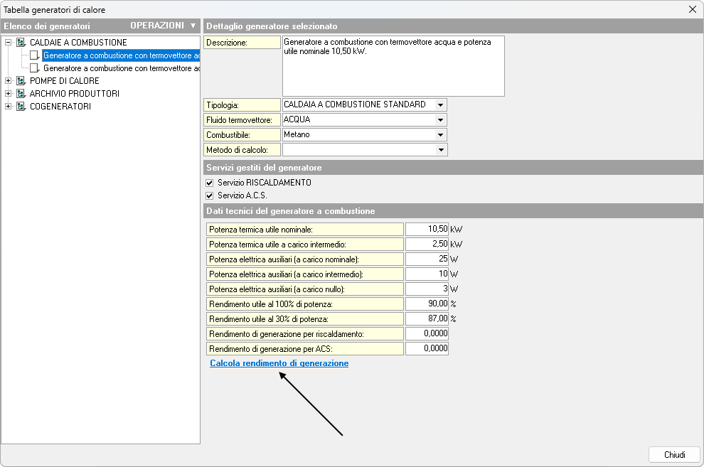 Se il valore non è noto e si tratta di un generatore da utilizzare per valutazioni su edifici esistenti, è possibile richiamare direttamente dall'archivio i Prospetti della norma UNI/TS 11300-2 e calcolare il rendimento tramite il pulsante Calcola rendimento di generazione.