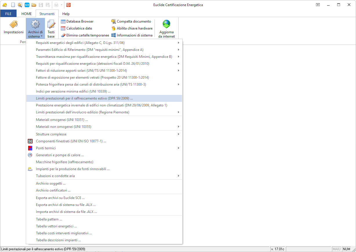 L'accesso all'archivio avviene tramite il comando Strumenti | Archivi di sistema | Limiti prestazionali per il raffrescamento estivo (DPR 59/2009).