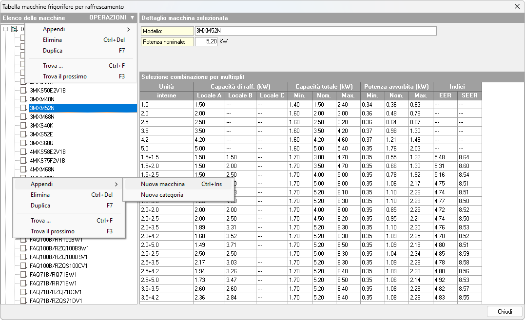 L'archivio delle Macchine frigorifere contiene i dati relativi a macchine per il raffrescamento utilizzabili nelle pratiche. I dati presenti si riferiscono a modelli specifici disponibili sul mercato, sia monosplit che multisplit.