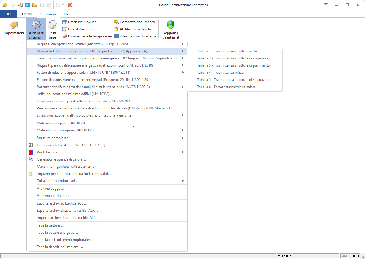 L'accesso all'archivio avviene tramite il comando Strumenti | Archivi di sistema | Parametri edificio di riferimento ("DM Requisiti minimi", Appendice A).