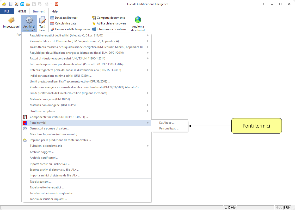 Euclide Certificazione Energetica consente di definire ponti termici personalizzati accedendo alla sezione dedicata tramite l'opzione Personalizzati... dal menu Strumenti | Tabelle di Sistema | Ponti Termici.