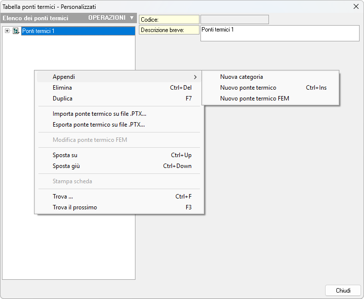 Per inserire nuovi ponti termici, utilizzare il menu pop-up del tasto destro del mouse oppure il menu associato al pulsante OPERAZIONI e selezionare Appendi | Nuova categoria o Appendi | Nuovo ponte termico.
