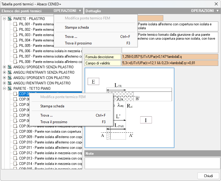 Cliccando con il tasto destro si apre un menu pop-up con i comandi per stampare la scheda del ponte termico selezionato o per ricercare una voce nell'archivio tramite i comandi Trova e Trova il prossimo.