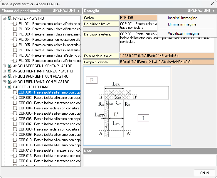 In alto a destra è presente il pulsante OPERAZIONI, dal quale è possibile inserire, eliminare o visualizzare l'immagine associata al ponte termico selezionato. Le stesse opzioni sono disponibili cliccando con il tasto destro sull'immagine.