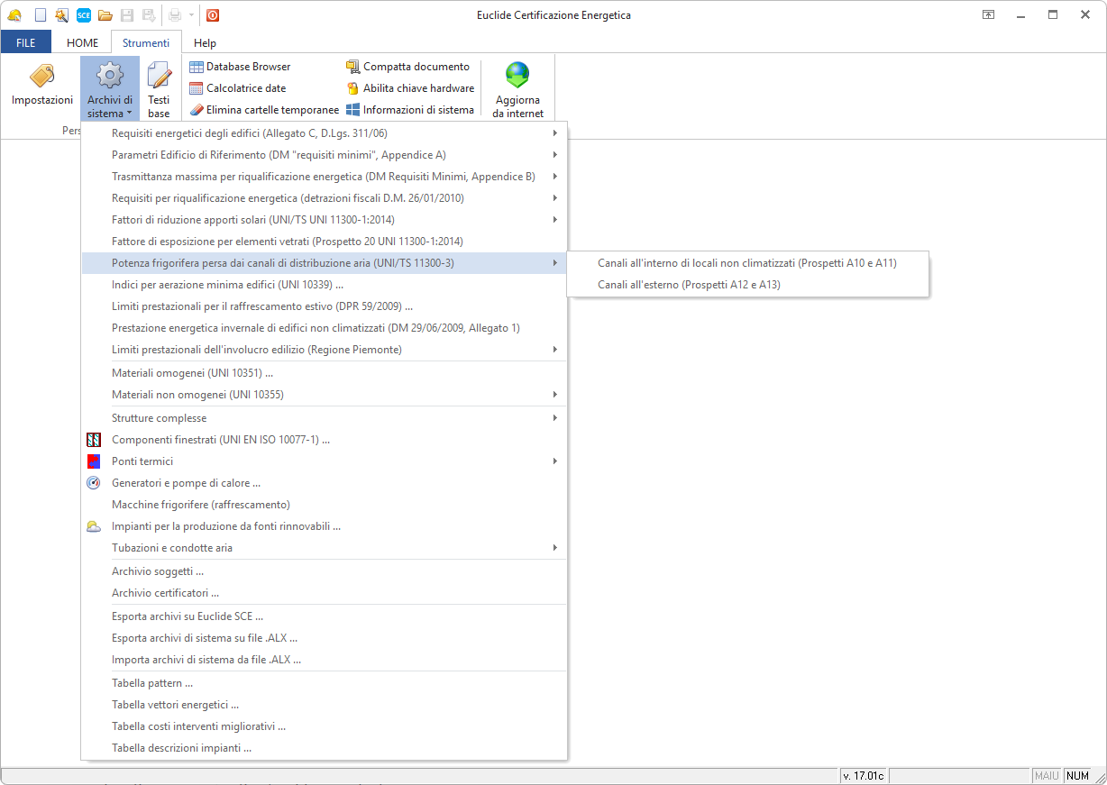 L'accesso all'archivio avviene tramite il comando Strumenti | Archivi di sistema | Potenza frigorifera persa dai canali di distribuzione aria (UNI/TS 11300-3).