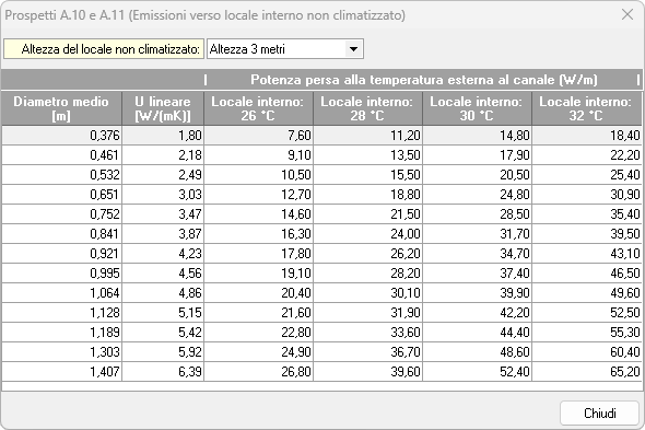 Nella tabella Canali all'interno di locali non climatizzati (Prospetti A10 e A11), selezionando l'altezza del locale non climatizzato 3 m o 6 m, vengono visualizzati i valori di potenza persa, espressi in W/m, nelle colonne corrispondenti alla temperatura interna del locale (°C).