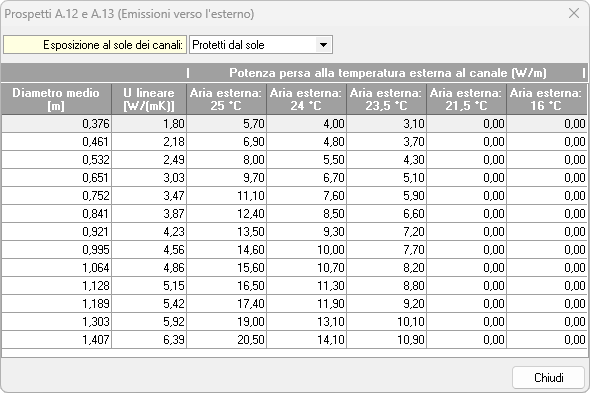 Nella tabella Canali all'esterno (Prospetti A12 e A13), selezionando l'esposizione dei canali Protetti dal sole o Esposti al sole, vengono riportati i valori della potenza persa verso l'esterno nelle colonne in base alla temperatura dell'aria (°C).