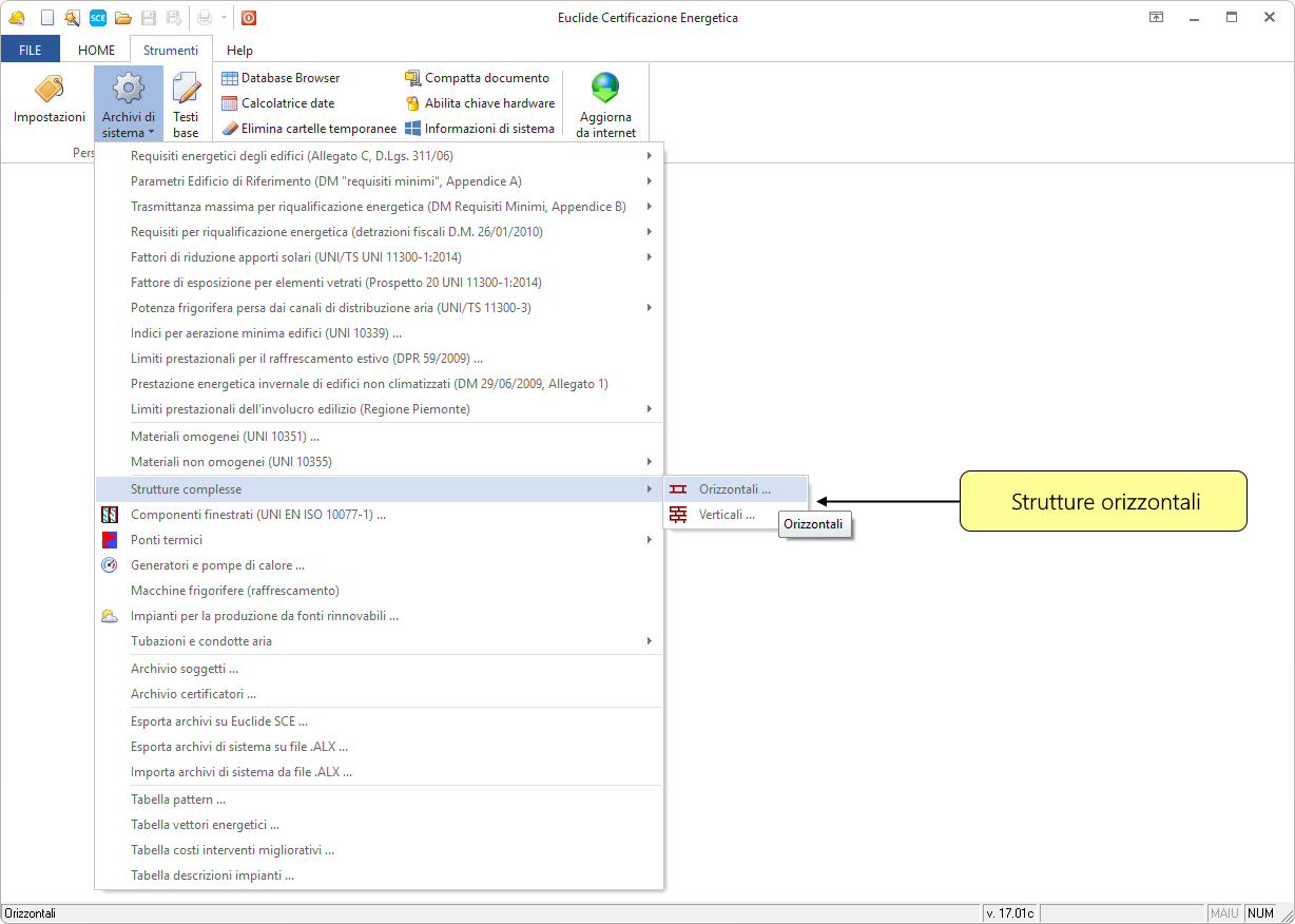 Nell'archivio di base fornito con il programma sono presenti anche le trasmittanze indicative di alcune strutture orizzontali, secondo la norma UNI/TR11552:2014. Questi dati sono utilizzabili esclusivamente per valutazioni energetiche di edifici esistenti.