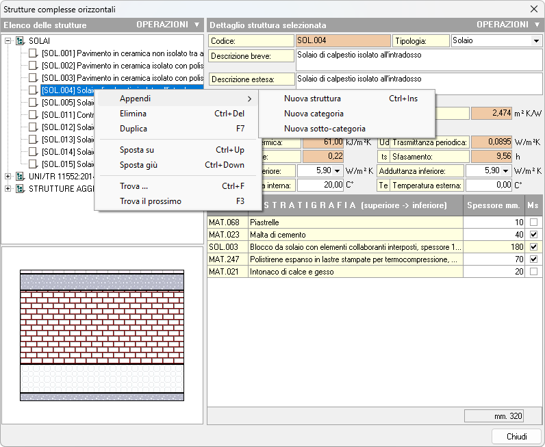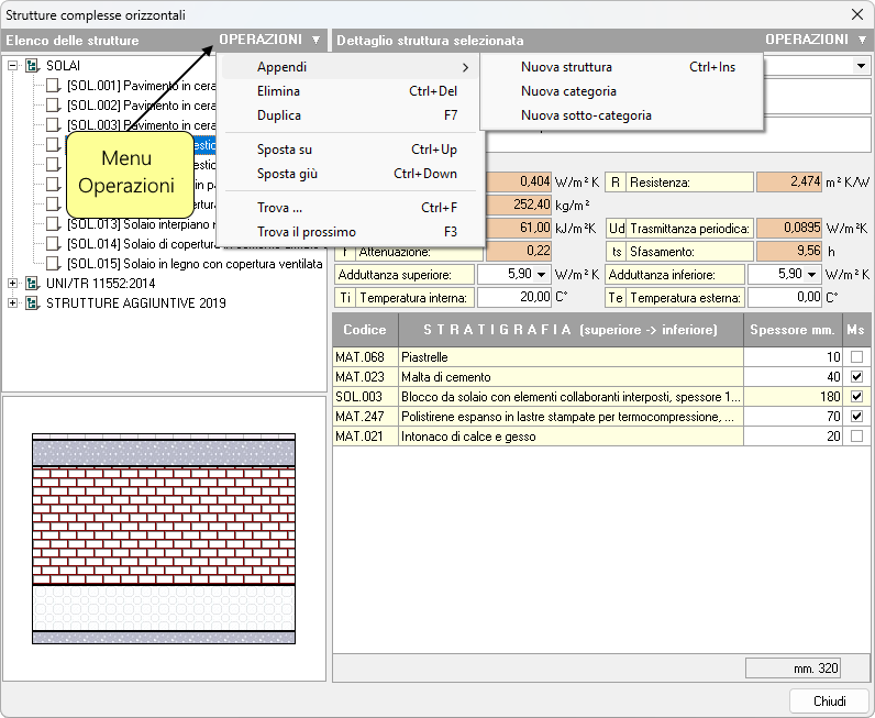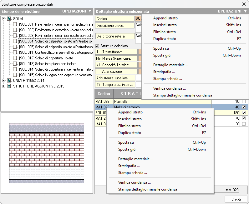 Premendo il tasto destro del mouse sull'elenco, oppure il pulsante OPERAZIONI, si accede a un menu pop-up dal quale è possibile effettuare operazioni sugli strati (appendere, eliminare, duplicare, spostare), visualizzare il dettaglio del materiale, vedere la stratigrafia con il grafico delle temperature o stampare la scheda.