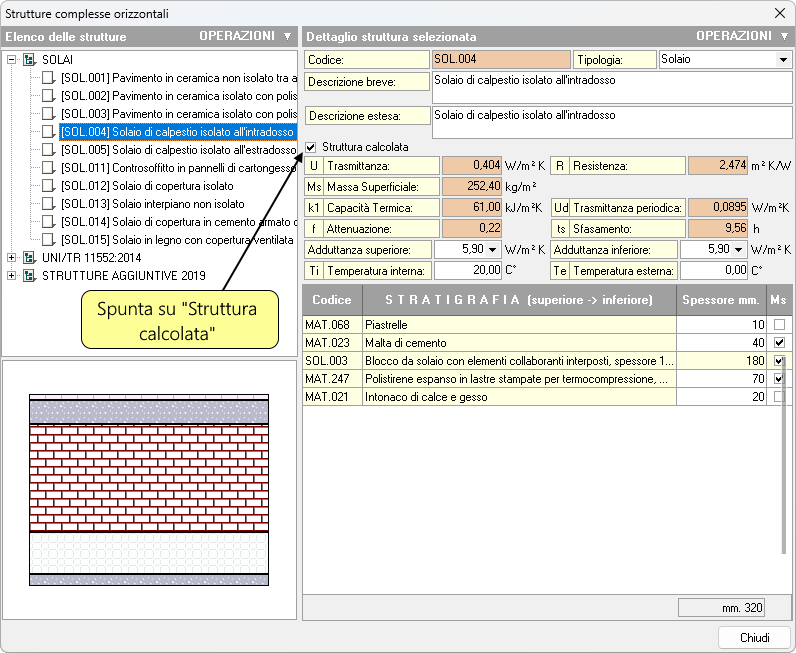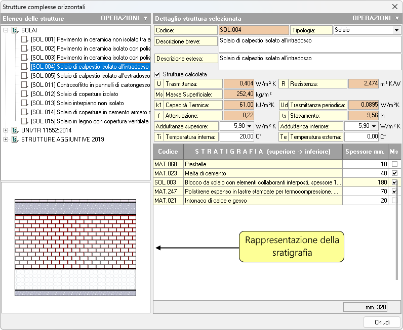 In basso a destra è presente l'elenco degli strati che compongono la struttura selezionata. Ogni strato corrisponde a un elemento dell'archivio materiali omogenei o materiali non omogenei. Per ciascuno strato sono note le caratteristiche termiche ed igrometriche, sulla base delle quali il software calcola le proprietà complessive della struttura finita.