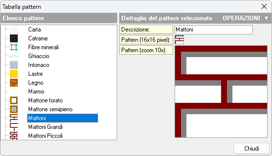 Questi pattern vengono utilizzati dal programma per comporre le immagini della stratigrafia degli elementi composti (come strutture verticali e orizzontali) e per la rappresentazione grafica degli infissi.