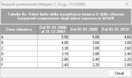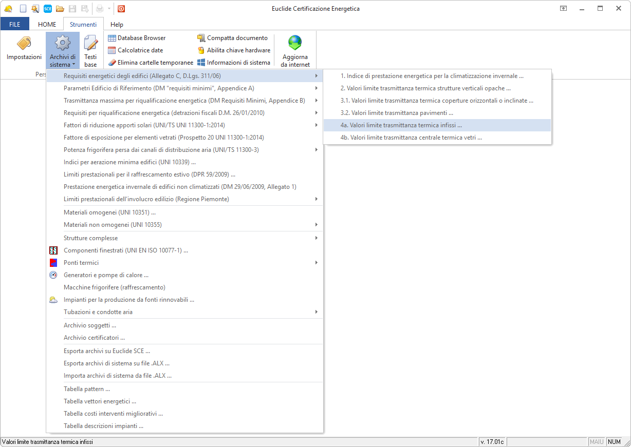 L'accesso all'archivio avviene tramite il comando Strumenti | Archivi di sistema | Requisiti energetici degli edifici | Valori limite trasmittanza termica infissi.