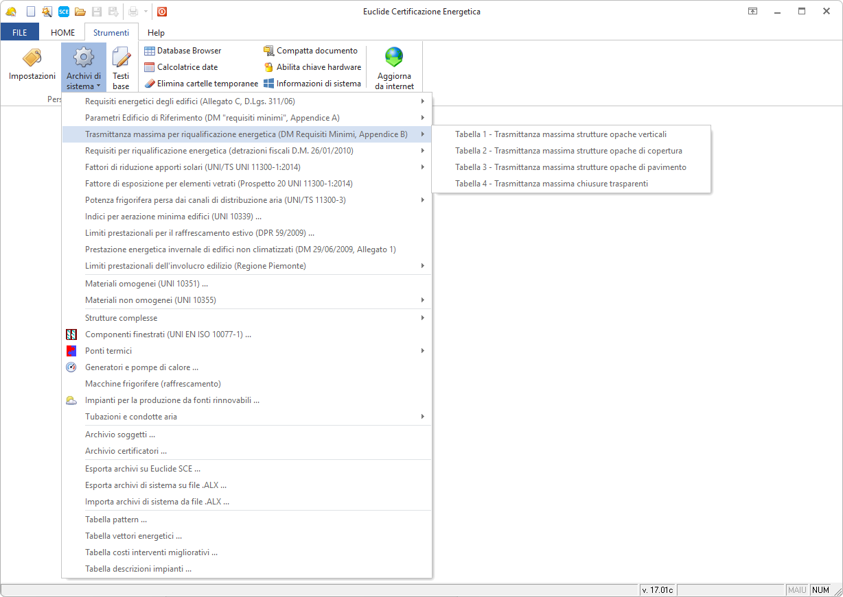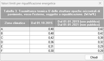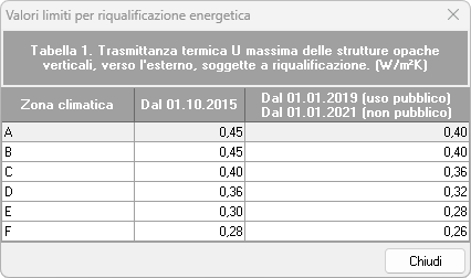L'accesso all'archivio avviene tramite il comando Strumenti | Archivi di sistema | Trasmittanza massima per riqualificazione energetica (DM "Requisiti minimi", Appendice B).
