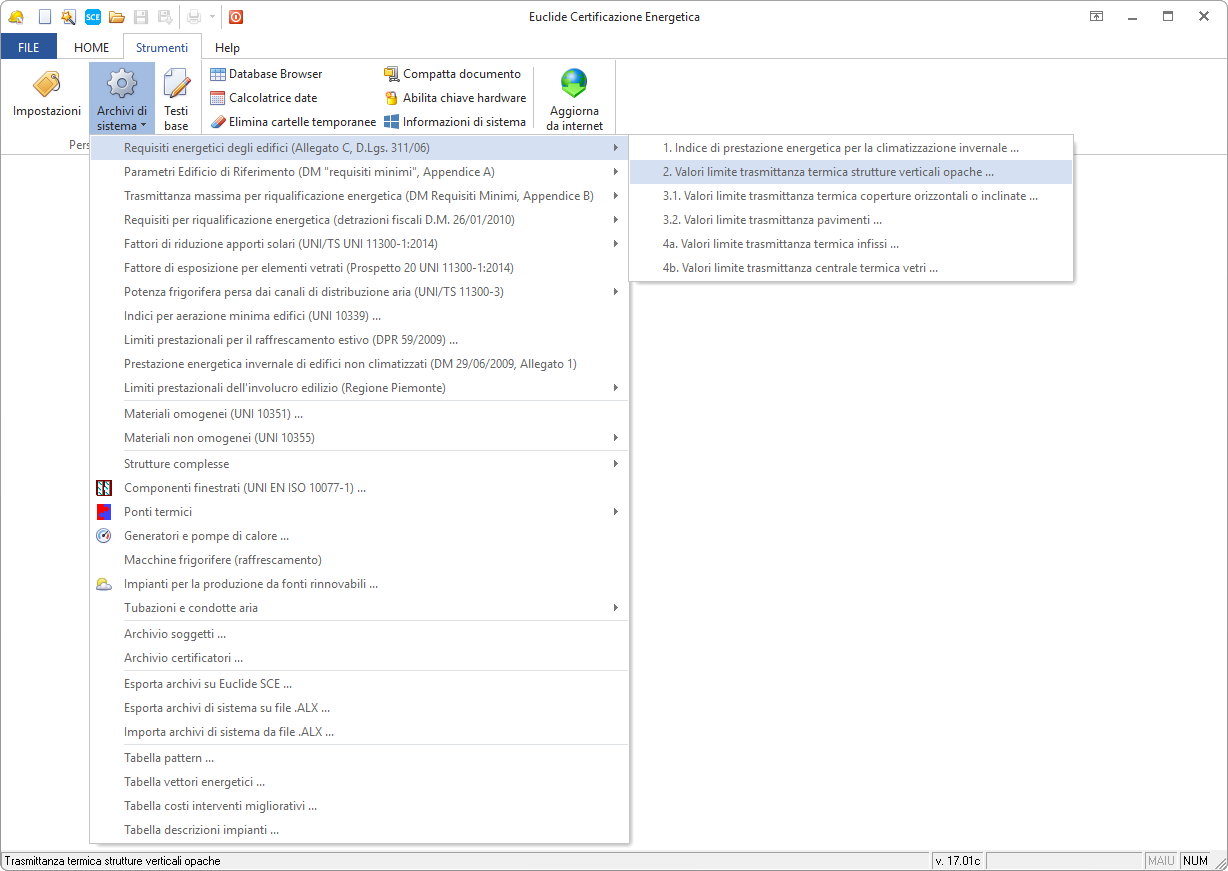 L'accesso all'archivio avviene tramite il comando Strumenti | Archivi di sistema | Requisiti energetici degli edifici | Valori limite della trasmittanza termica delle strutture verticali opache....