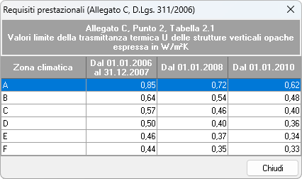 La tabella dei Valori limite della trasmittanza termica delle strutture opache verticali si riferisce ai limiti di trasmittanza U per le strutture verticali definiti nell'Allegato C del D.Lgs. 311/2006.