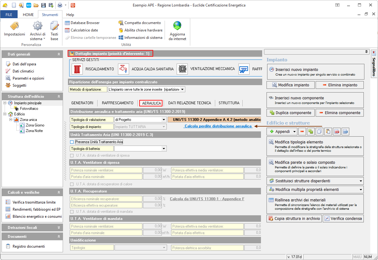 È possibile richiamare le condotte d'aria precedentemente inserite nell'archivio. Per farlo, occorre accedere alla sezione Dettaglio impianto e aprire la sotto-pagina Aeraulica.