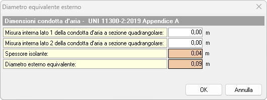 Alla destra dei campi Diametro eq. esterno e Diametro eq. interno è presente il pulsante Calcola. Selezionandolo, si apre una finestra dedicata che consente di determinare il diametro inserendo i parametri richiesti. Il valore calcolato viene quindi riportato automaticamente nel campo corrispondente.