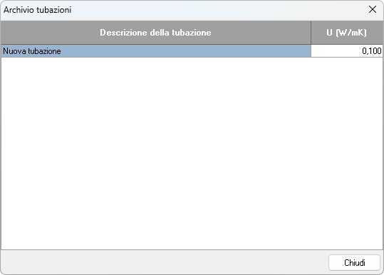 L'archivio delle Tubazioni serve a gestire e definire le caratteristiche delle tubazioni degli impianti presenti nel modello energetico. In pratica, permette di creare un elenco di tipologie di tubazioni e di assegnare a ciascuna un valore di trasmittanza lineica (U espressa in W/mK), cioè il parametro che rappresenta le dispersioni termiche lungo la tubazione.