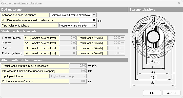 È possibile assegnare manualmente la trasmittanza lineica, qualora il valore sia già noto. In alternativa, cliccando sul pulsante contrassegnato dai tre puntini, si accede alla finestra dedicata al calcolo della trasmittanza della tubazione, che consente di determinarne il valore in modo guidato.