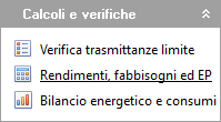 La funzione Rendimenti, fabbisogni ed EP è disponibile nel gruppo Calcoli e Verifiche dell'indice del documento e consente di elaborare i calcoli e le verifiche nelle pratiche di progetto, fornendo un riepilogo dettagliato dei risultati.
