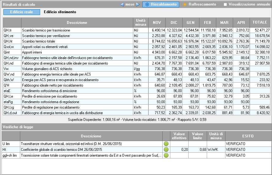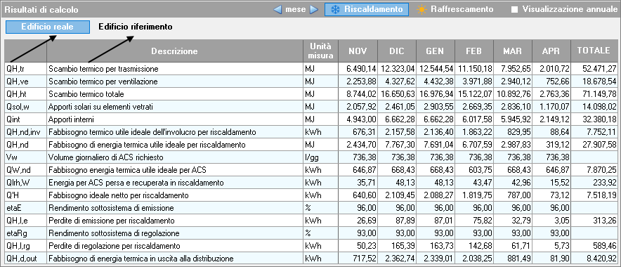 In caso di pratica di progetto, nella parte superiore della pagina è possibile scegliere se visualizzare i dati relativi all'edificio reale o all'edificio di riferimento, utilizzando gli appositi pulsanti.