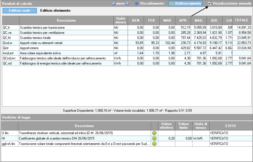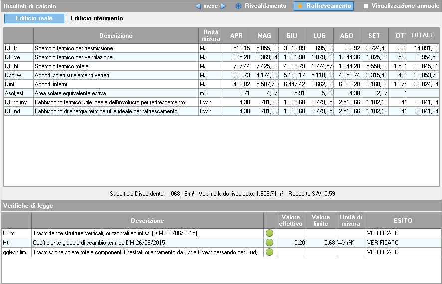 Premendo sul pulsante Raffrescamento, se presente il relativo fabbisogno, viene visualizzato il dettaglio del calcolo del fabbisogno dell'involucro edilizio per la stagione estiva.