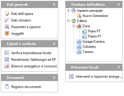 In questa sezione è possibile effettuare i calcoli e le verifiche energetiche dell'edificio, analizzando la trasmittanza degli elementi, i rendimenti degli impianti, i fabbisogni energetici e gli indici di prestazione (EP).