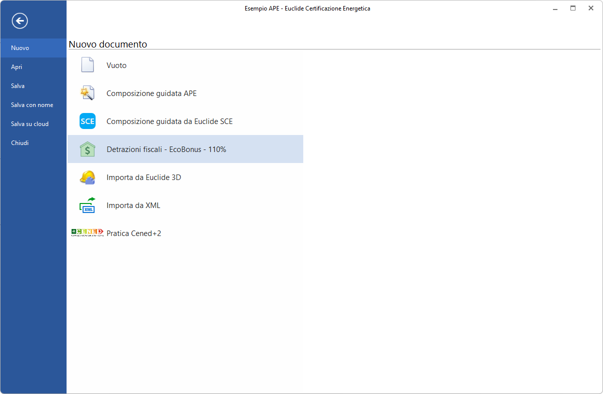 Per inserire una pratica ex novo, utilizzare il comando File | Nuovo | Detrazioni fiscali – EcoBonus – 110%.