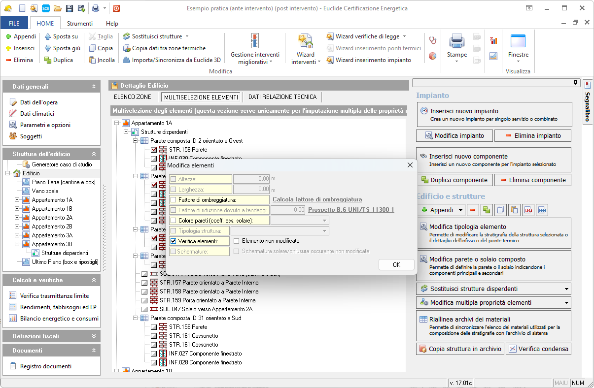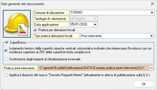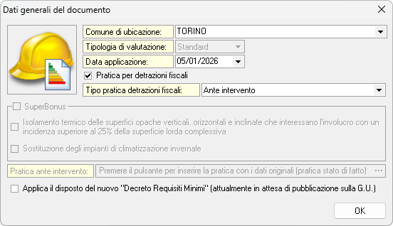 In questo modo la pratica sarà predisposta senza verifiche di legge, con l'obiettivo di redigere l'APE "ante intervento" sulla base degli elementi disperdenti (solai, pareti verticali, infissi e ponti termici) e della parte impiantistica (sistemi di generazione, distribuzione, emissione e regolazione), secondo la norma UNI 11300.