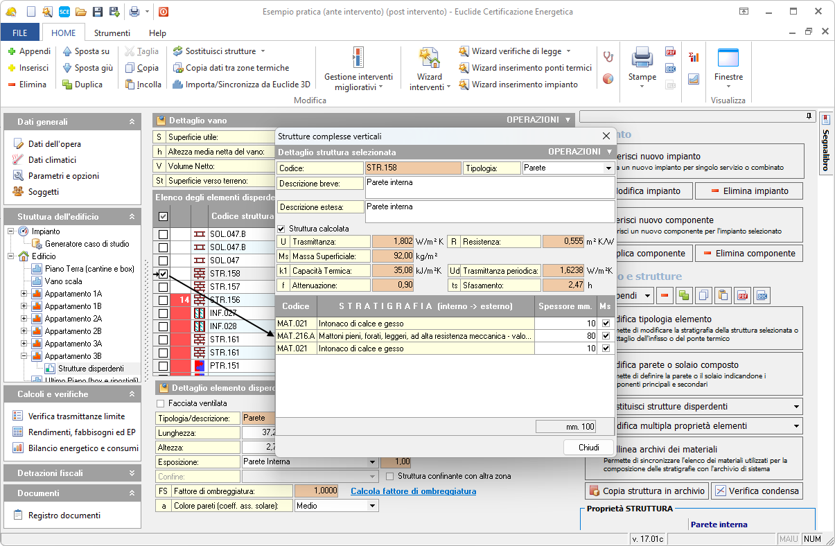 Per modificare le strutture disperdenti, è necessario aggiornare la stratigrafia (ad esempio aggiungendo un cappotto termico) tramite doppio click sull'elemento interessato oppure utilizzando le funzioni di Wizard interventi involucro.