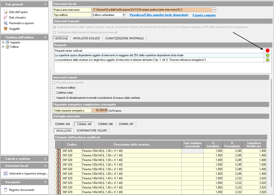 Dopo aver verificato il rispetto dei Requisiti minimi, è possibile controllare gli ulteriori requisiti richiesti dalla normativa, in base alla tipologia di intervento trainante selezionata, tramite la funzione Interventi e risparmio energetico.