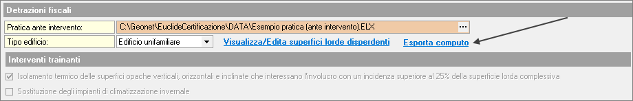 Per esportare i dati, premere il pulsante Esporta computo dalla schermata Interventi e risparmio energetico.
