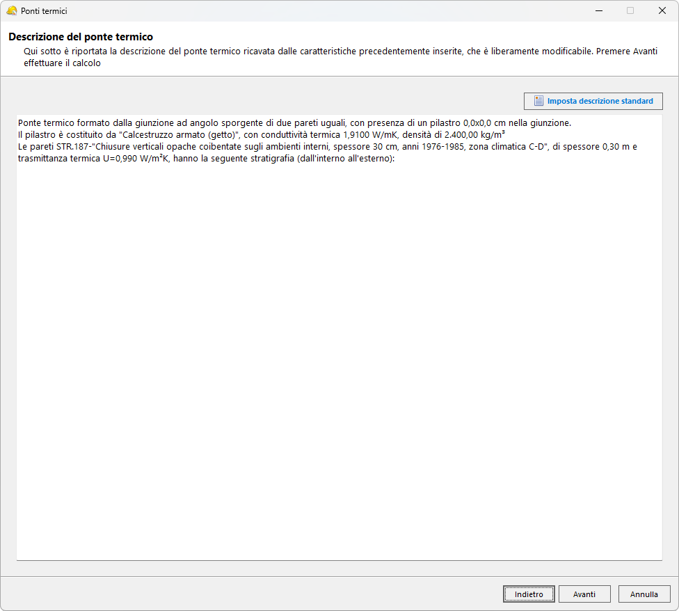 La pagina Descrizione del ponte termico viene compilata automaticamente in base alla tipologia di ponte termico e alle caratteristiche termofisiche degli elementi inseriti nelle fasi precedenti.