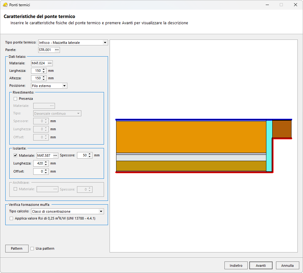Quando tutti i campi che caratterizzano il ponte termico sono stati compilati, selezionare Avanti per accedere alla pagina successiva del wizard, dove è possibile personalizzare la descrizione del ponte termico in analisi.
