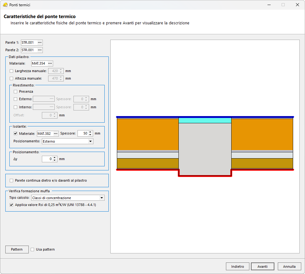 Selezionando la tipologia di ponte termico Pilastro, si accede alla pagina in cui è possibile definire le caratteristiche fisiche e termiche di questo archetipo.