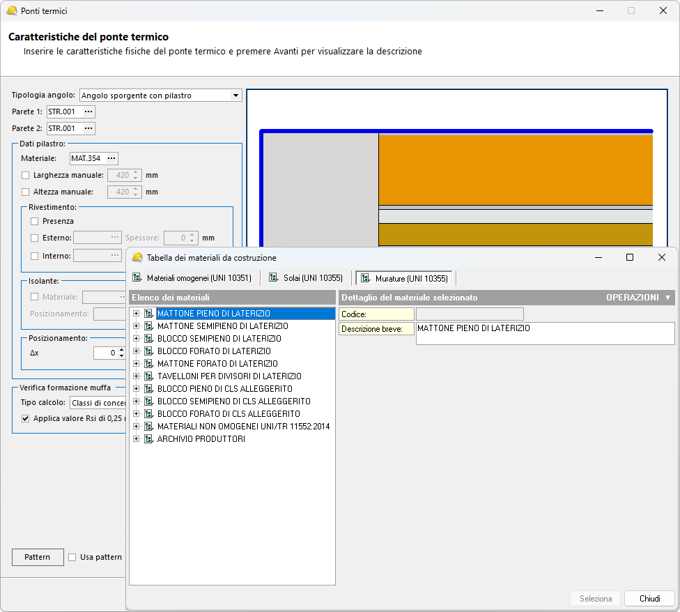 Le proprietà termofisiche vengono assegnate selezionando i materiali che compongono le strutture di contorno al ponte termico. È possibile utilizzare tutti gli archivi dei materiali e delle strutture di Euclide Certificazione Energetica per facilitare questa fase.