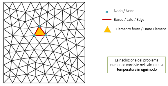 Il metodo agli elementi finiti prevede la suddivisione delle strutture in "elementi finiti", che costituiscono la "mesh" di calcolo. I vertici di ciascun elemento rappresentano i "nodi" di calcolo. Una mesh più fitta, composta da elementi più piccoli, garantisce una maggiore precisione ma richiede tempi di calcolo superiori. Euclide Certificazione Energetica seleziona automaticamente la granularità della mesh per bilanciare precisione e velocità di esecuzione.
