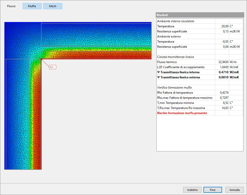 Il sistema di matrici viene risolto applicando le condizioni al contorno (temperature interne ed esterne). Anche questa fase è gestita in modo automatico dal modulo.Calcolo dei risultati e verifica muffa
