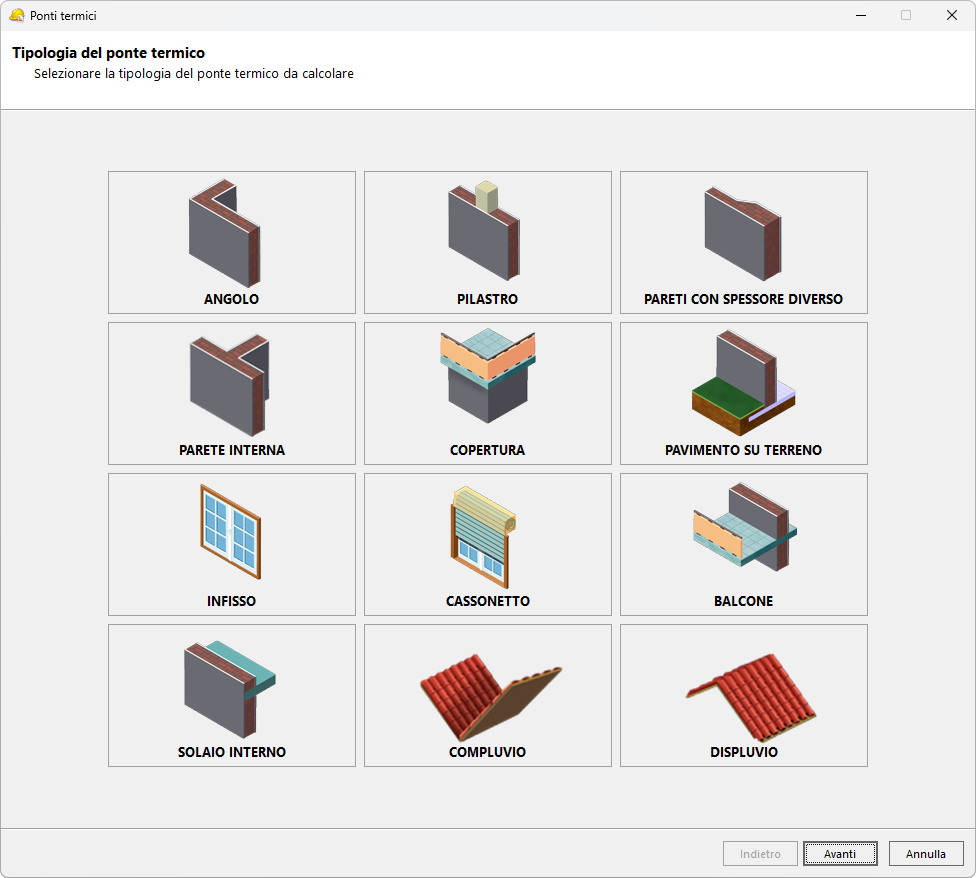 La schermata iniziale del modulo è dedicata alla selezione della Tipologia di ponte termico. In questa fase è necessario scegliere, tra gli archetipi proposti, quello che meglio rappresenta il ponte termico da analizzare.