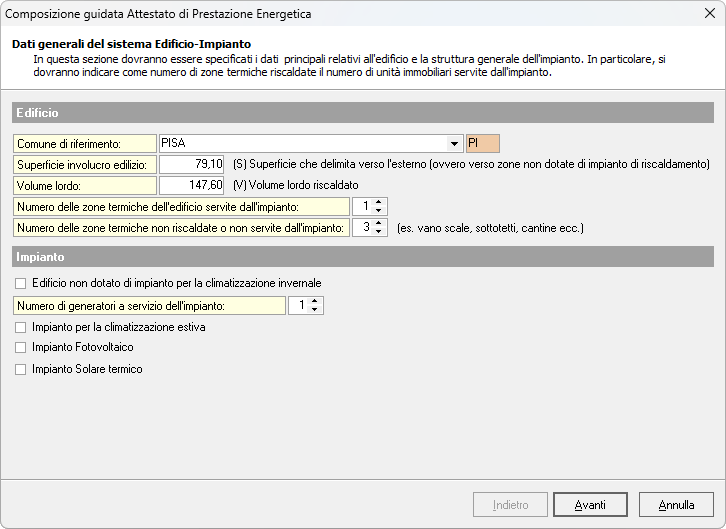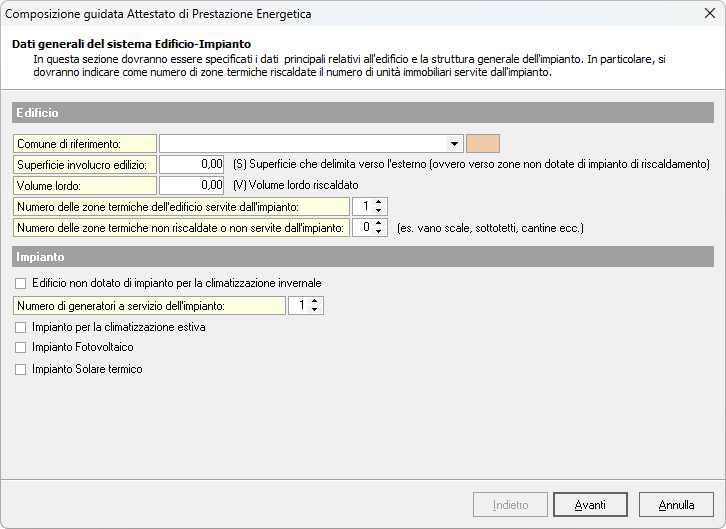 Questa funzione guida l'utente nell'inserimento dei dati minimi necessari, con particolare attenzione alla parte impiantistica, semplificando la compilazione dell'attestato di prestazione energetica.